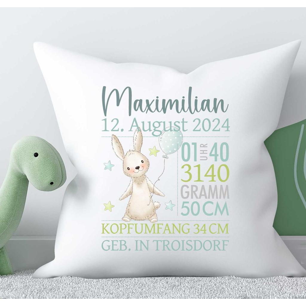 Liebevoll gestaltete Kissen. Personalisiert mit dem Namen und den Geburtsdaten Ihres Kindes.