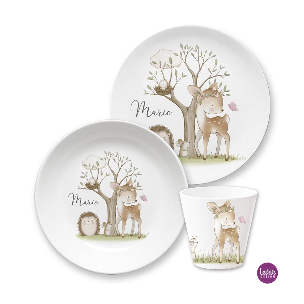 Zauberhaftes 3 teiliges personalisierbares Kindergeschirr aus Melamin, hergestellt in Deutschland