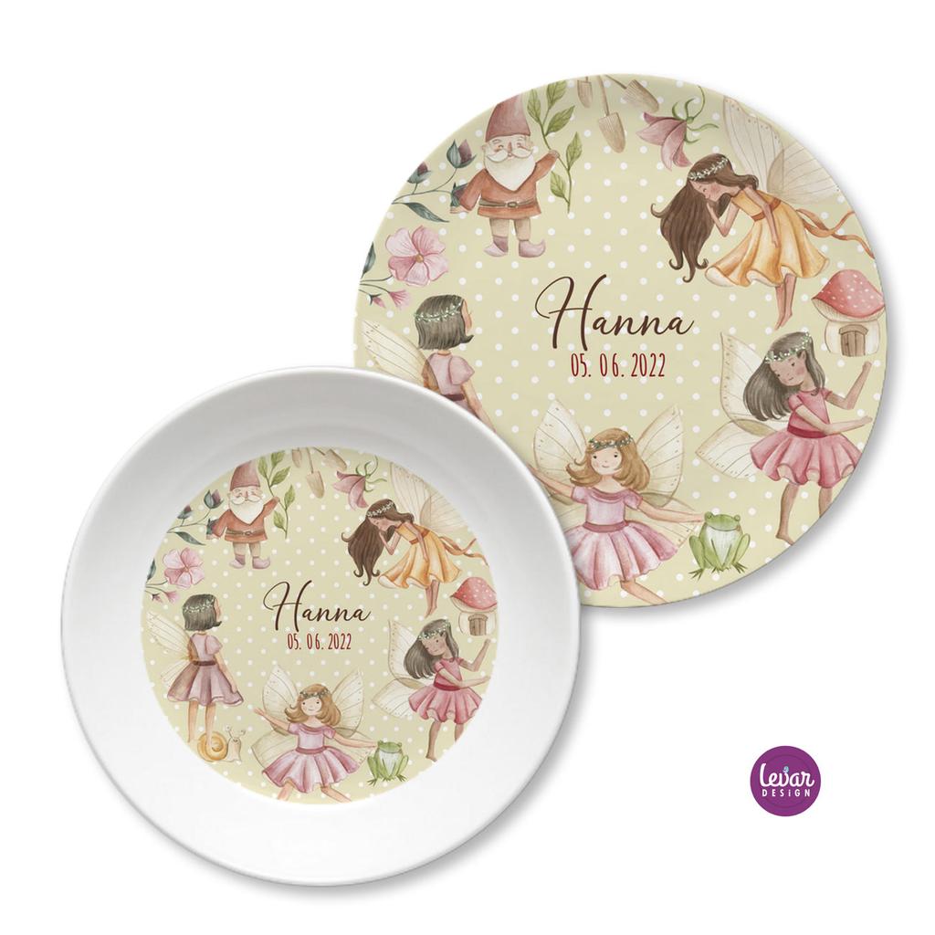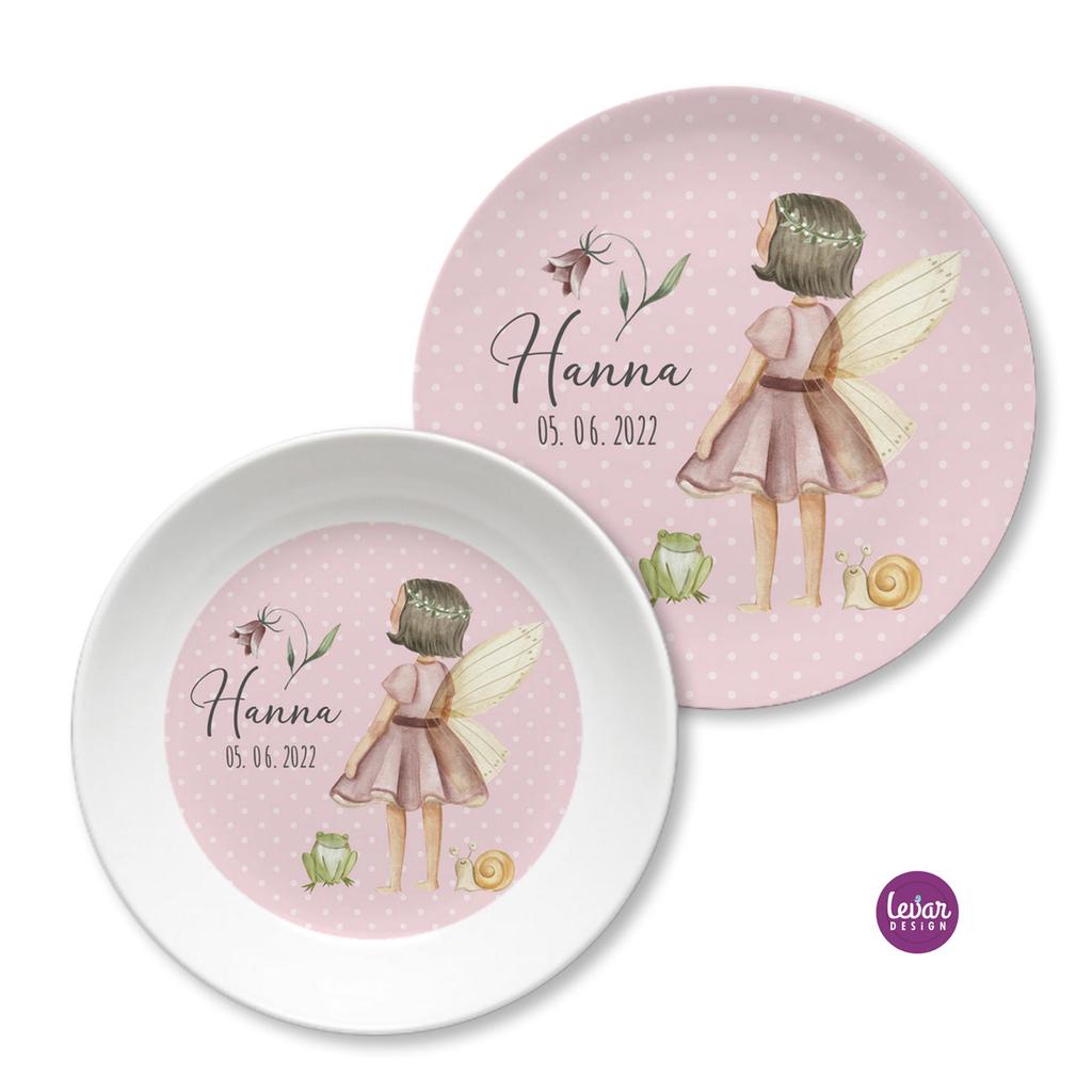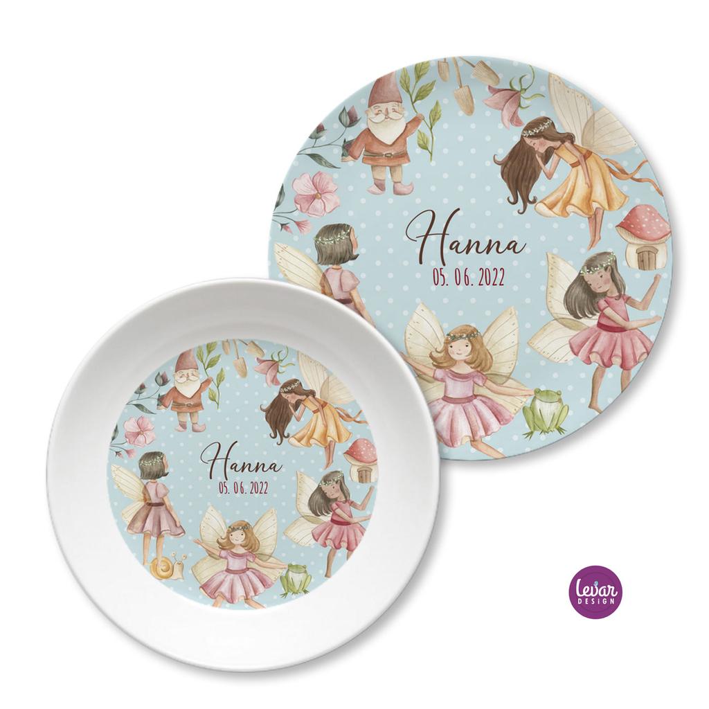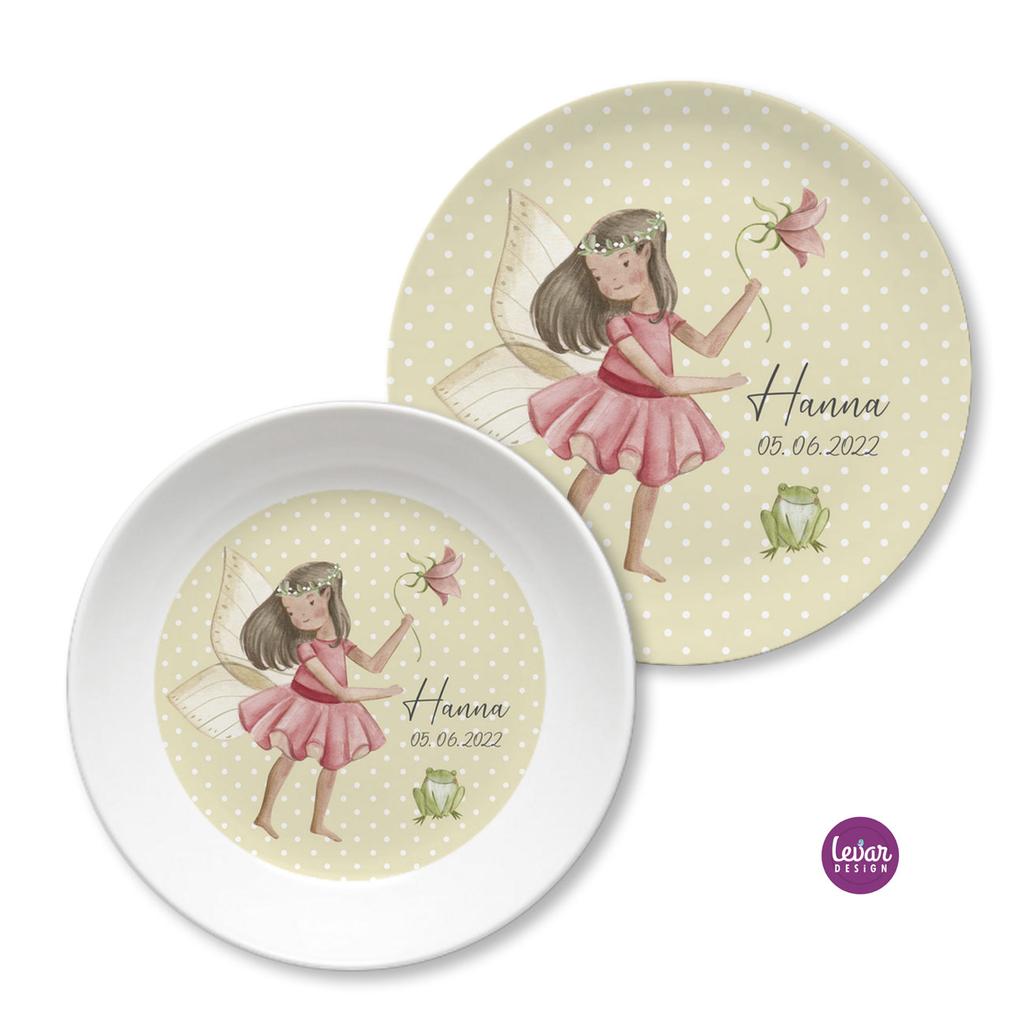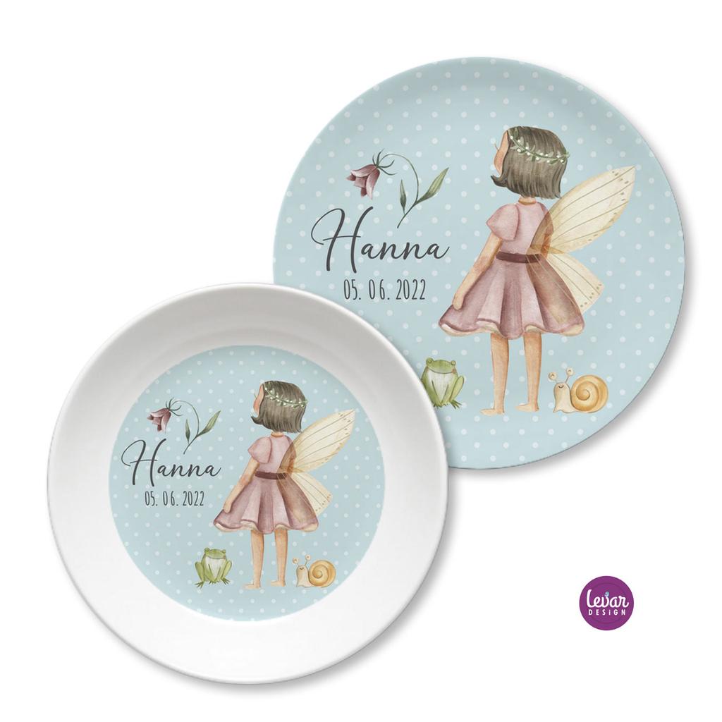 Zauberhaftes, 2 teiliges personalisierbares Kindergeschirr aus Melamin für Kinder.