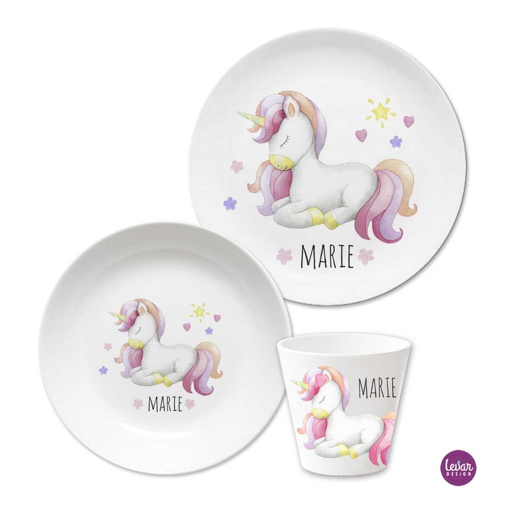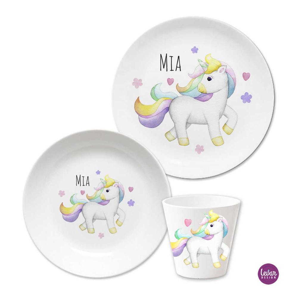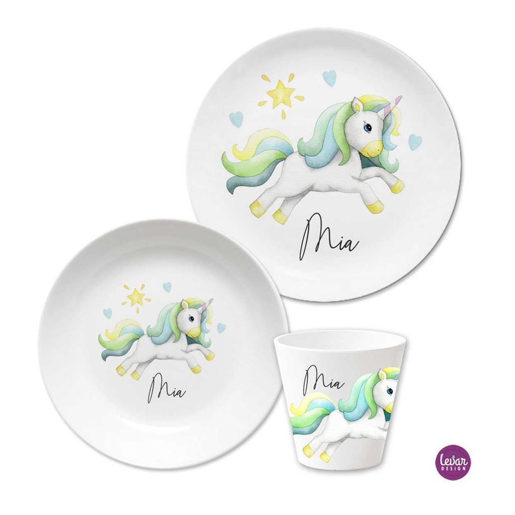 Zauberhaftes 3 teiliges personalisierbares Kindergeschirr aus Melamin, hergestellt in Deutschland