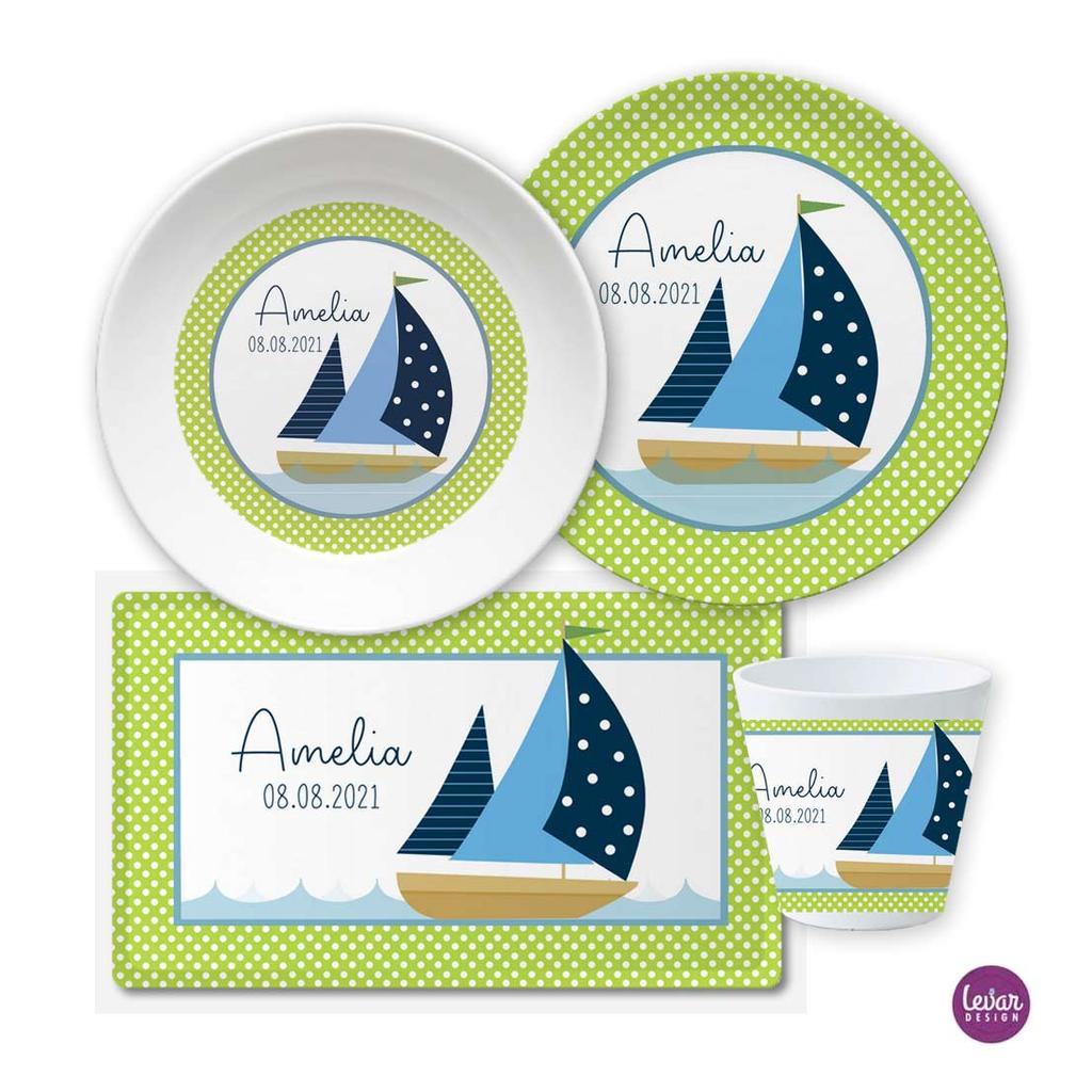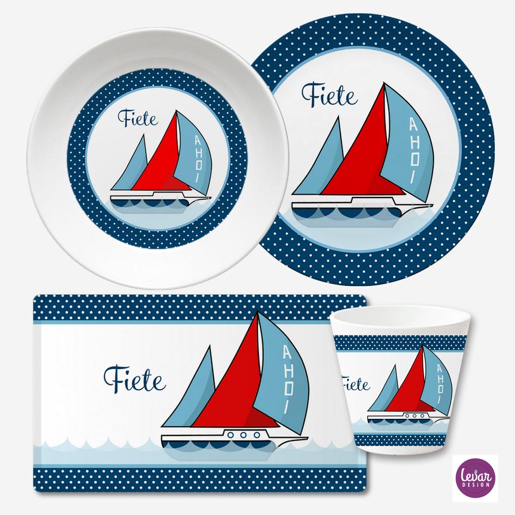 Kindergeschirr Set mit Namen personalisiert, Segelschiff