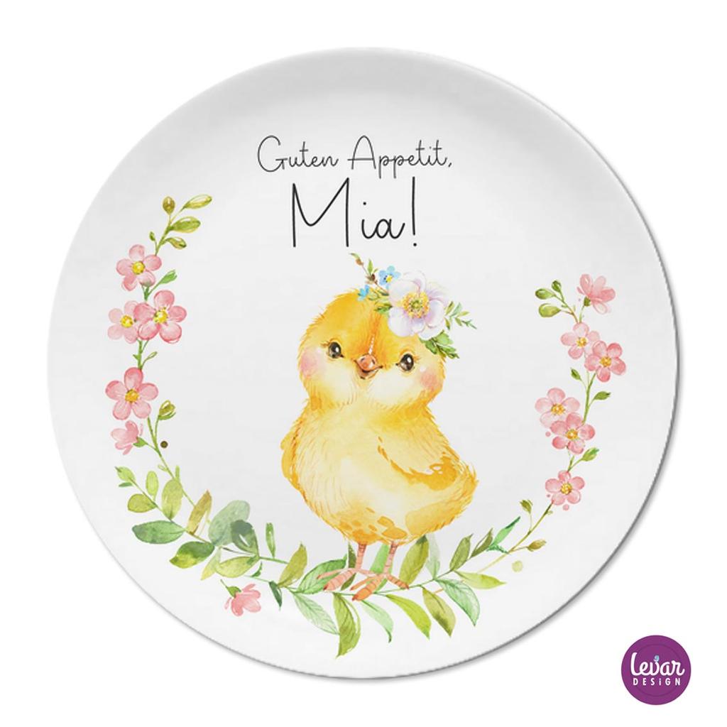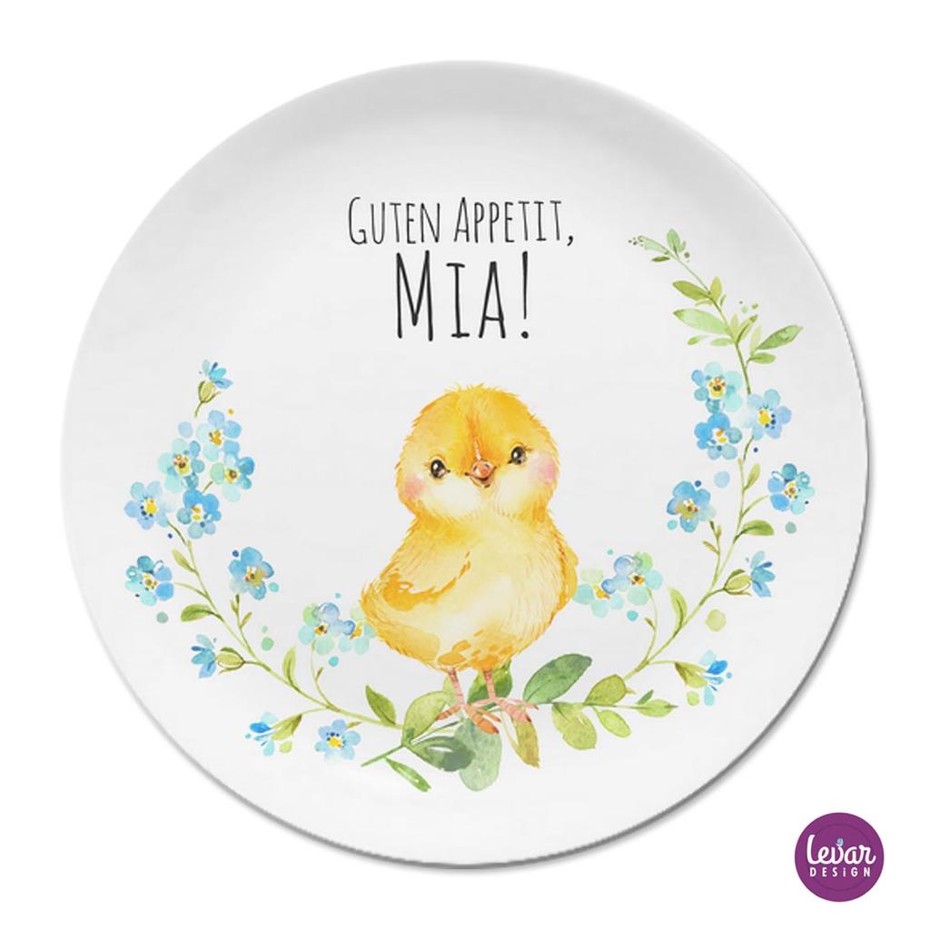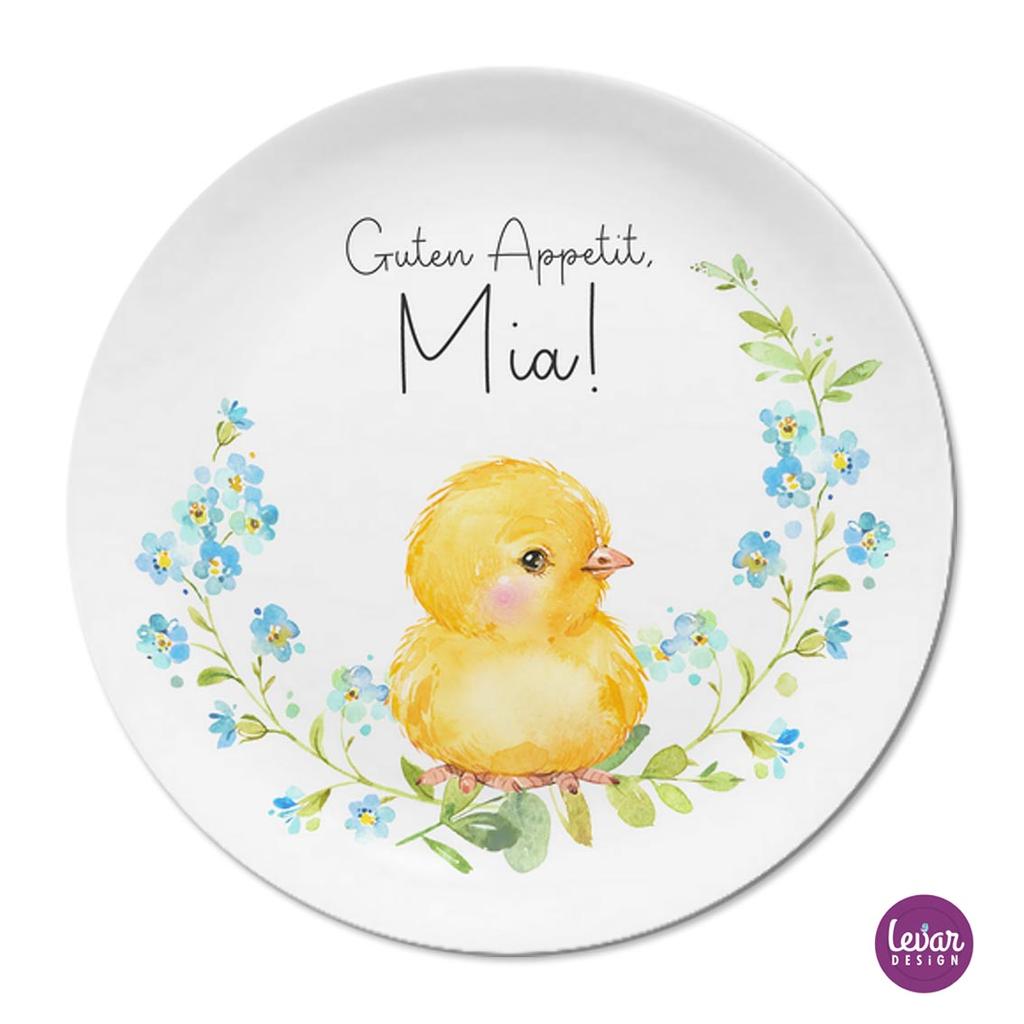 Flacher Melaminteller 235 mm, personalisierbar mit dem Namen des Kindes.