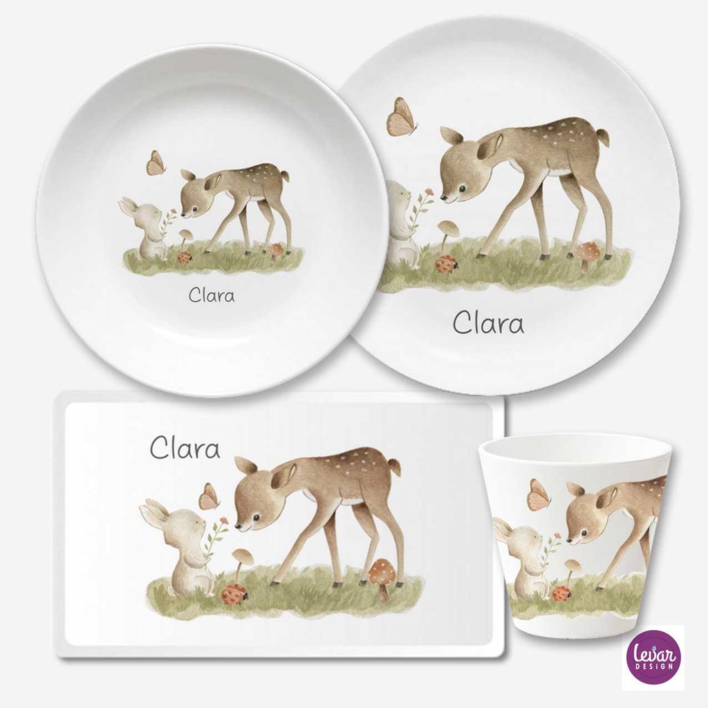 Zauberhaftes 4 teiliges personalisierbares Kindergeschirr aus Melamin, hergestellt in Deutschland