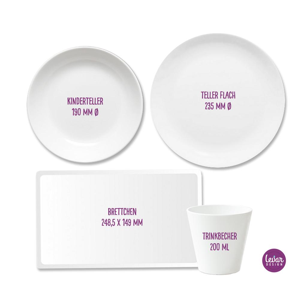 | 4er Set | kleiner Teller Ø 19,5 cm, Schälchen Ø 19,0 cm, Trinkbecher Ø 80 mm, Höhe 75 mm, Füllmenge: 200 ml, Brettchen 248,5 x 149 mm |