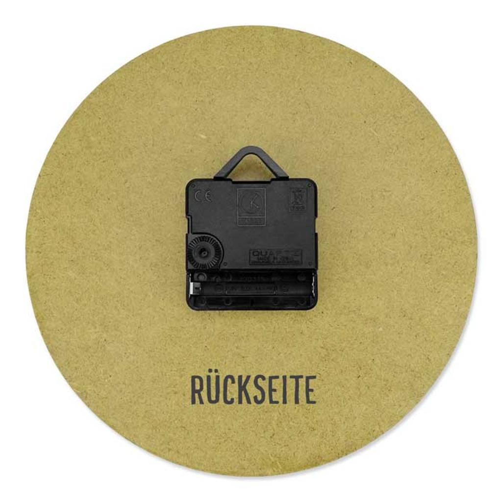| Material: | Gedruckt auf MDF-Zifferblatt, Rückseite Natur/braun, Lieferung inklusive leisem Quarz-Uhrwerk, Mit Montage des Zeigers, OHNE BATTERIE (AA-Batterie einlegen), Zeiger und Ziffern Schwarz, Gewicht: ca. 200g |