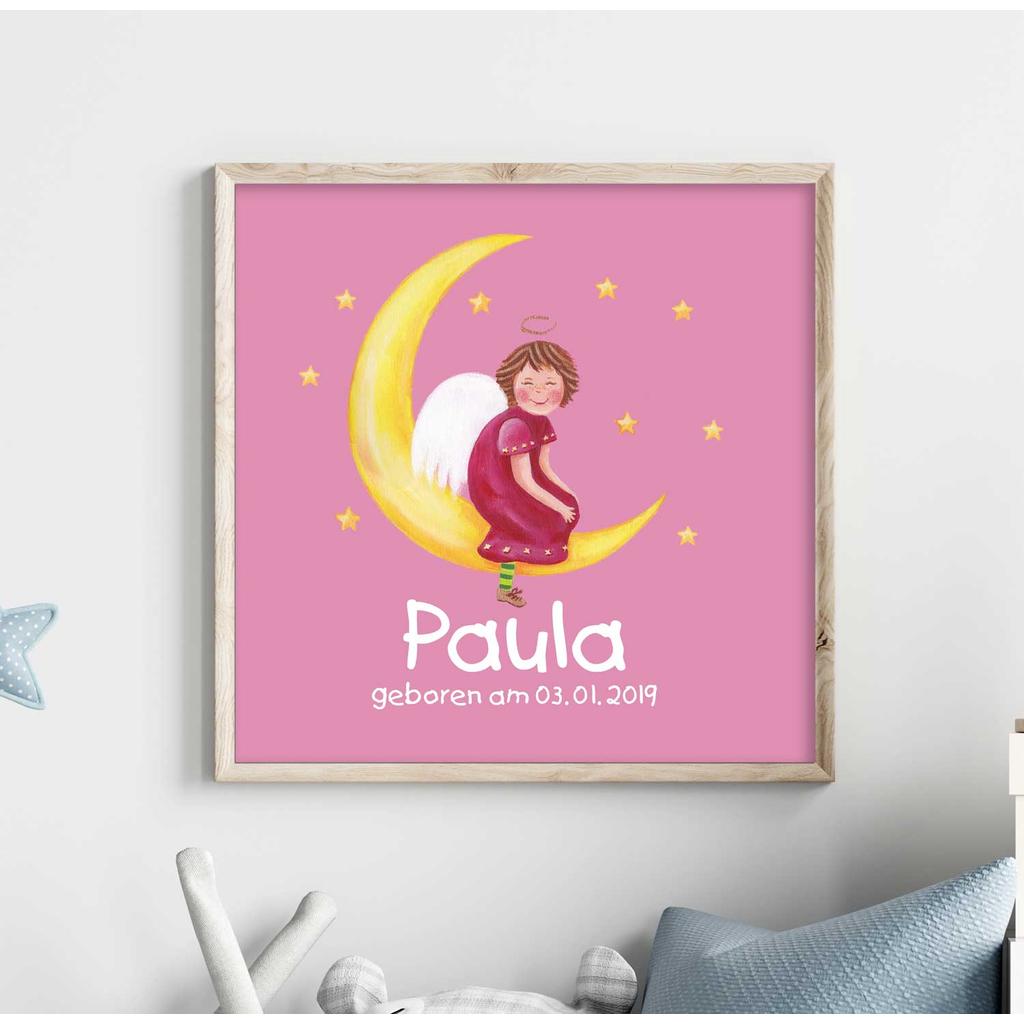 Zauberhaftes Schutzengelbild mit dem Namen Ihres Kindes und dem Geburtsdatum. Eine schöne Geschenkidee zur Geburt und Taufe.