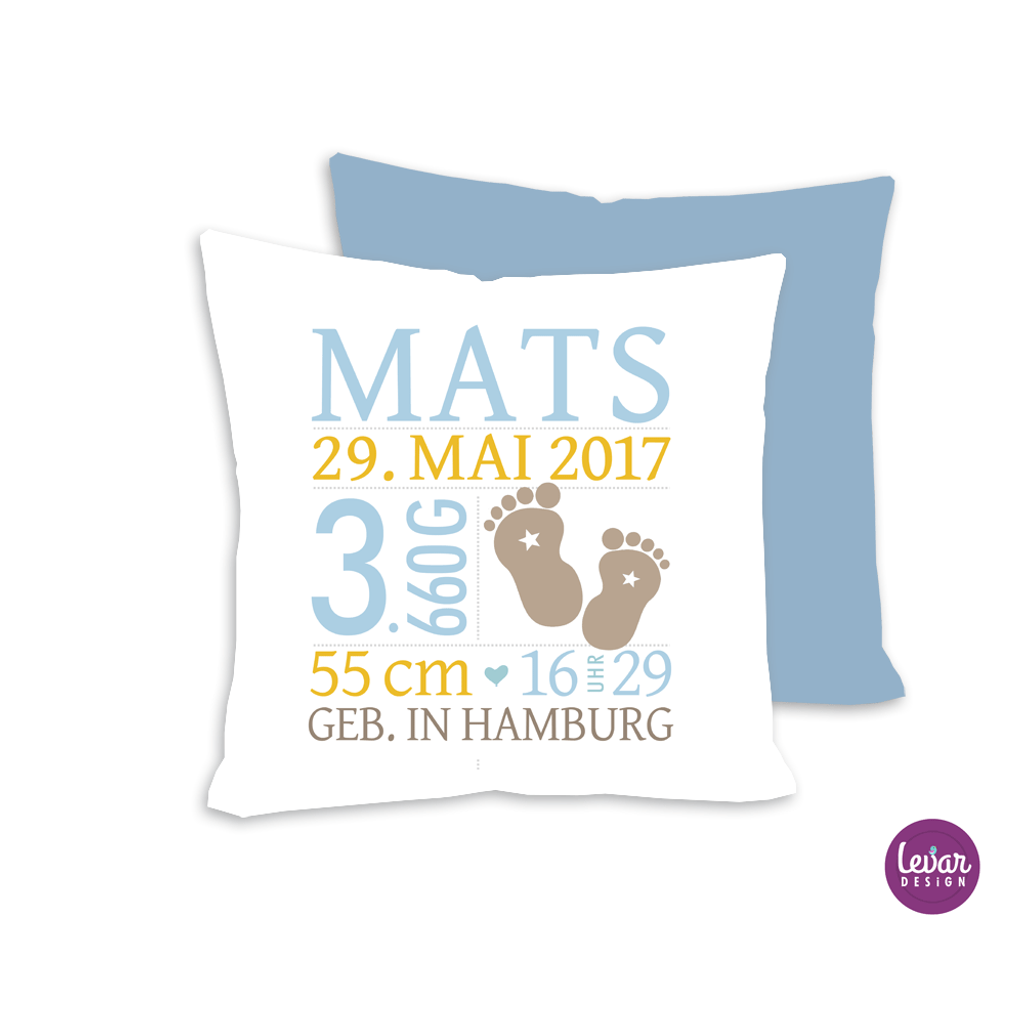 Liebevoll gestaltete Kissen. Personalisiert mit dem Namen und den Geburtsdaten Ihres Kindes.