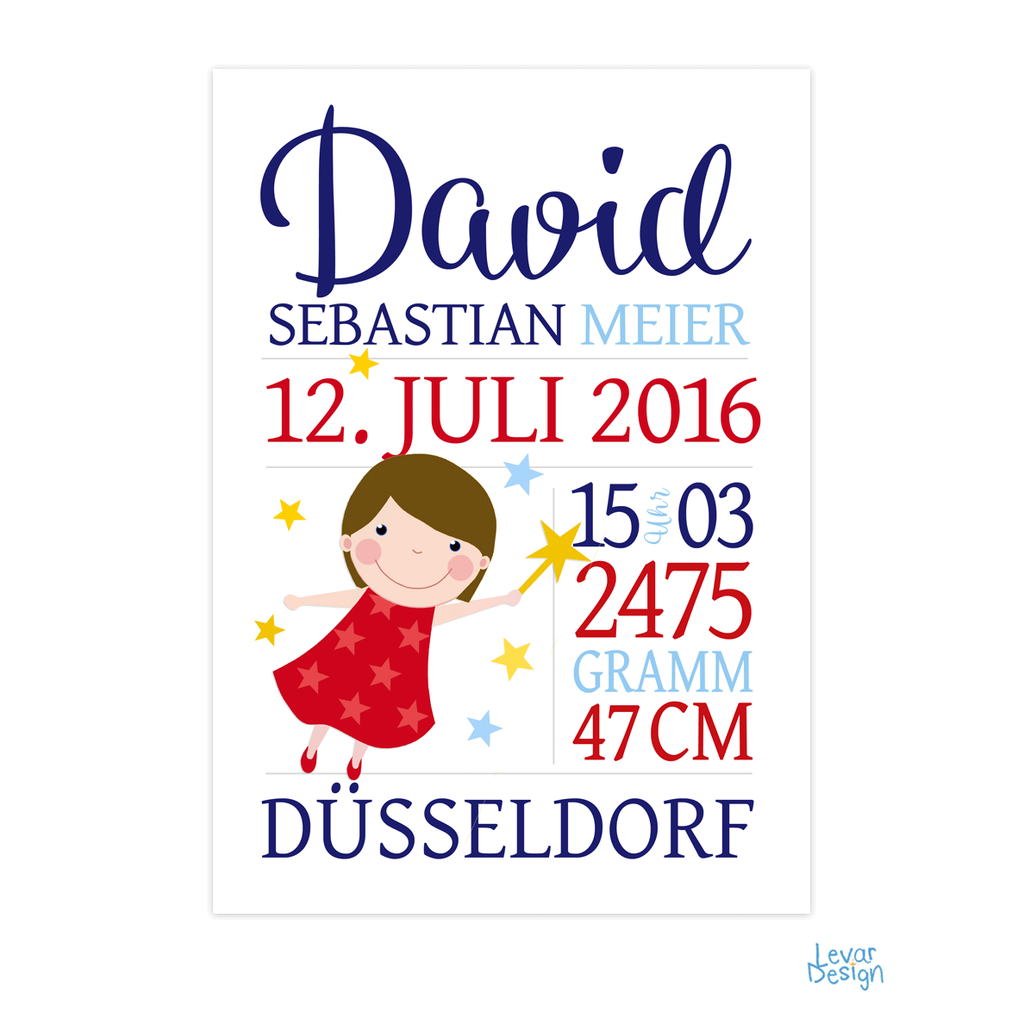 Zauberhaftes Namensbild mit den Daten Ihres Kindes als schöne Geschenkidee zur Geburt und Taufe.