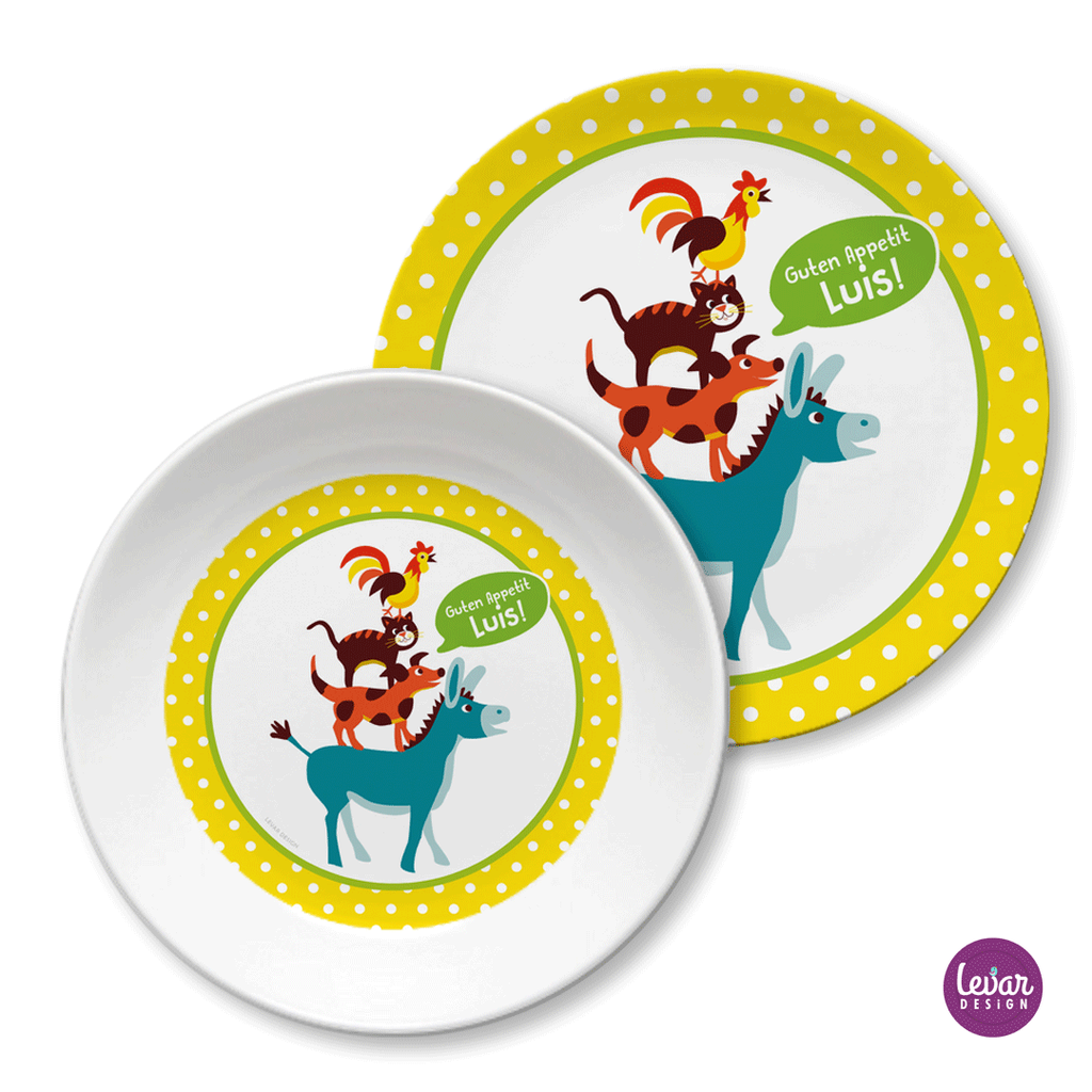 1) 190 mm tiefer Melaminteller/Schale (der Name des Kindes kann nur innerhalb des Motivs gedruckt werden).