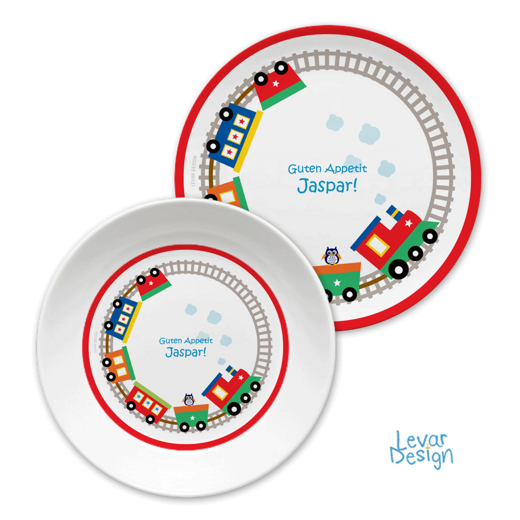1) 190 mm tiefer Melaminteller/Schale (der Name des Kindes kann nur innerhalb des Motivs gedruckt werden).