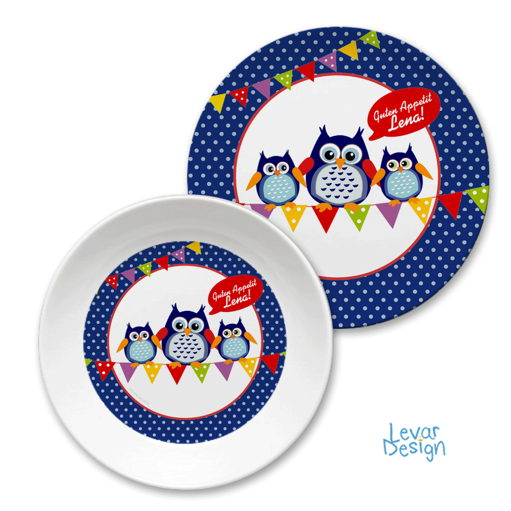 1) 190 mm tiefer Melaminteller/Schale (der Name des Kindes kann nur innerhalb des Motivs gedruckt werden).