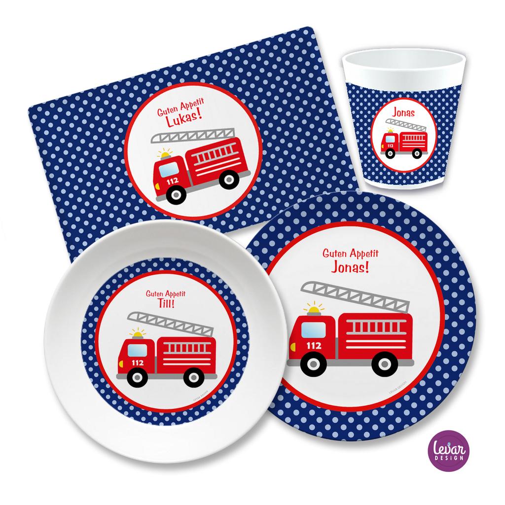 Kindergeschirr Set mit Namen personalisiert, Feuerwehr - 4 teilig