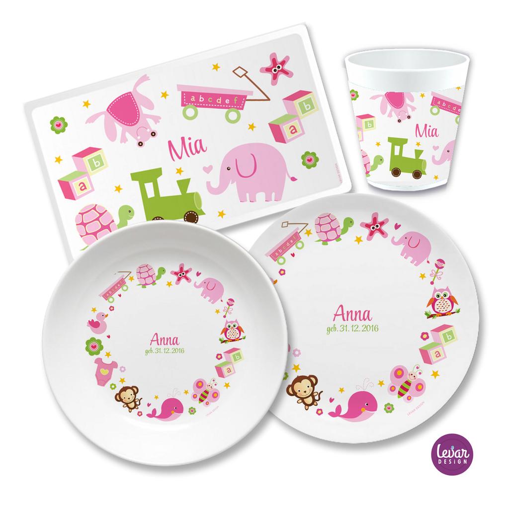 Zauberhaftes 4 teiliges personalisierbares Kindergeschirr aus Melamin, hergestellt in Deutschland