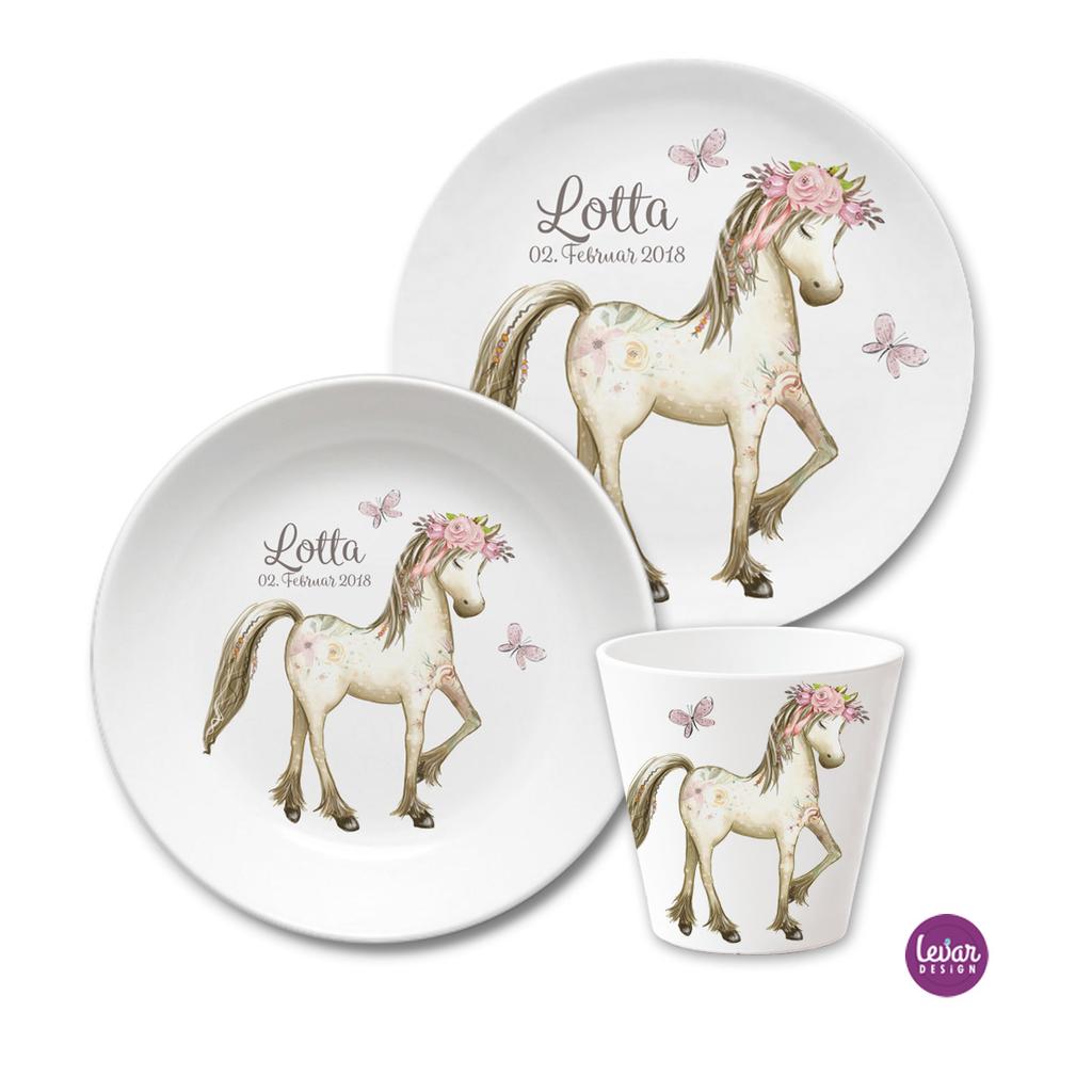 Zauberhaftes 3 teiliges personalisierbares Kindergeschirr aus Melamin, hergestellt in Deutschland