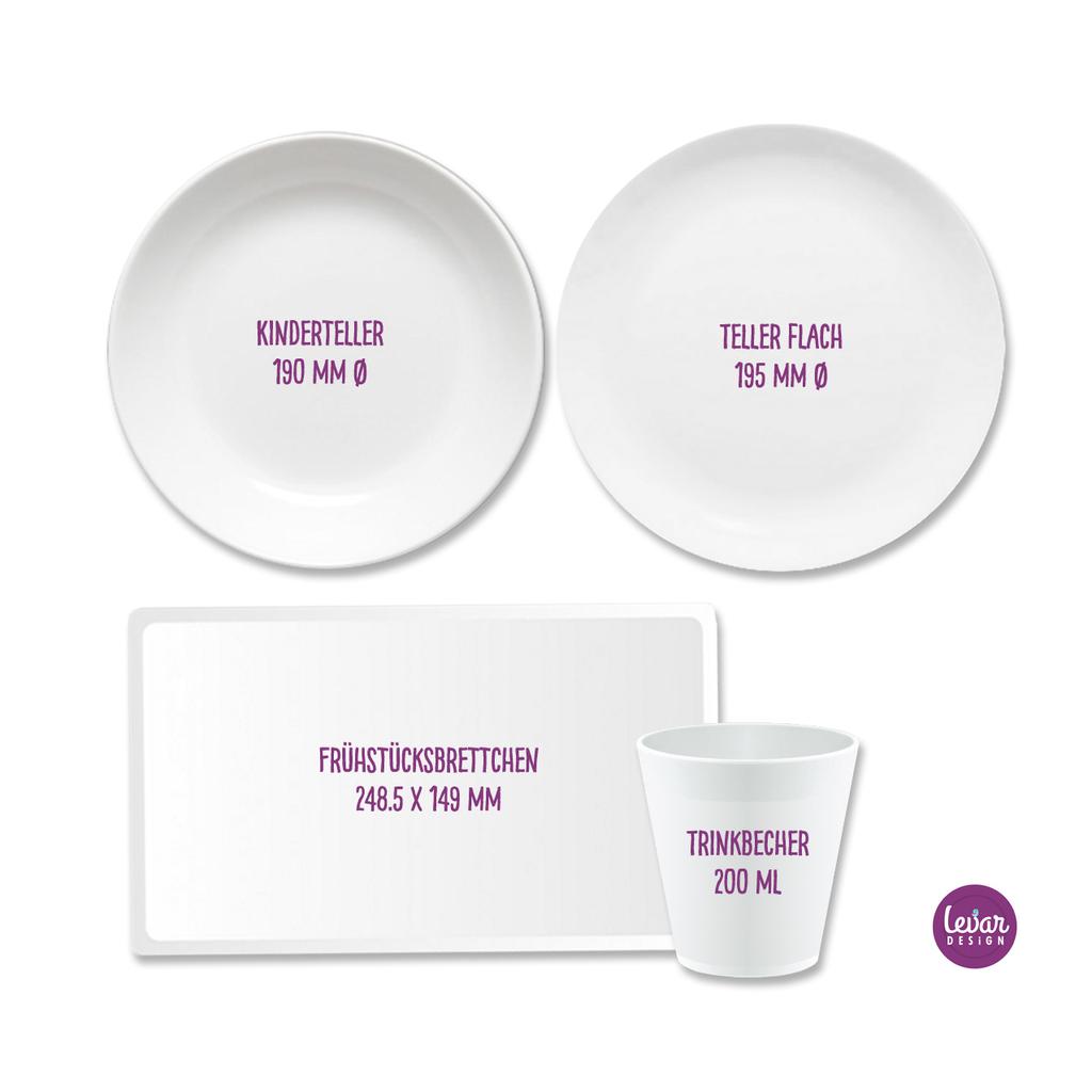 Zauberhaftes 4 teiliges personalisierbares Kindergeschirr aus Melamin, hergestellt in Deutschland