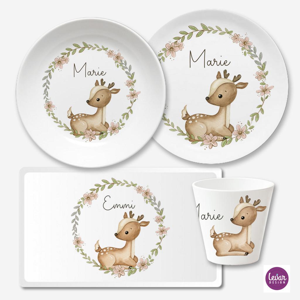 Kindergeschirrset 4 teilig aus Melamin, Reh Kranz