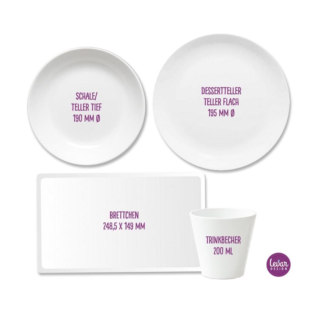 Zauberhaftes 4 teiliges personalisierbares Kindergeschirr aus Melamin, hergestellt in Deutschland