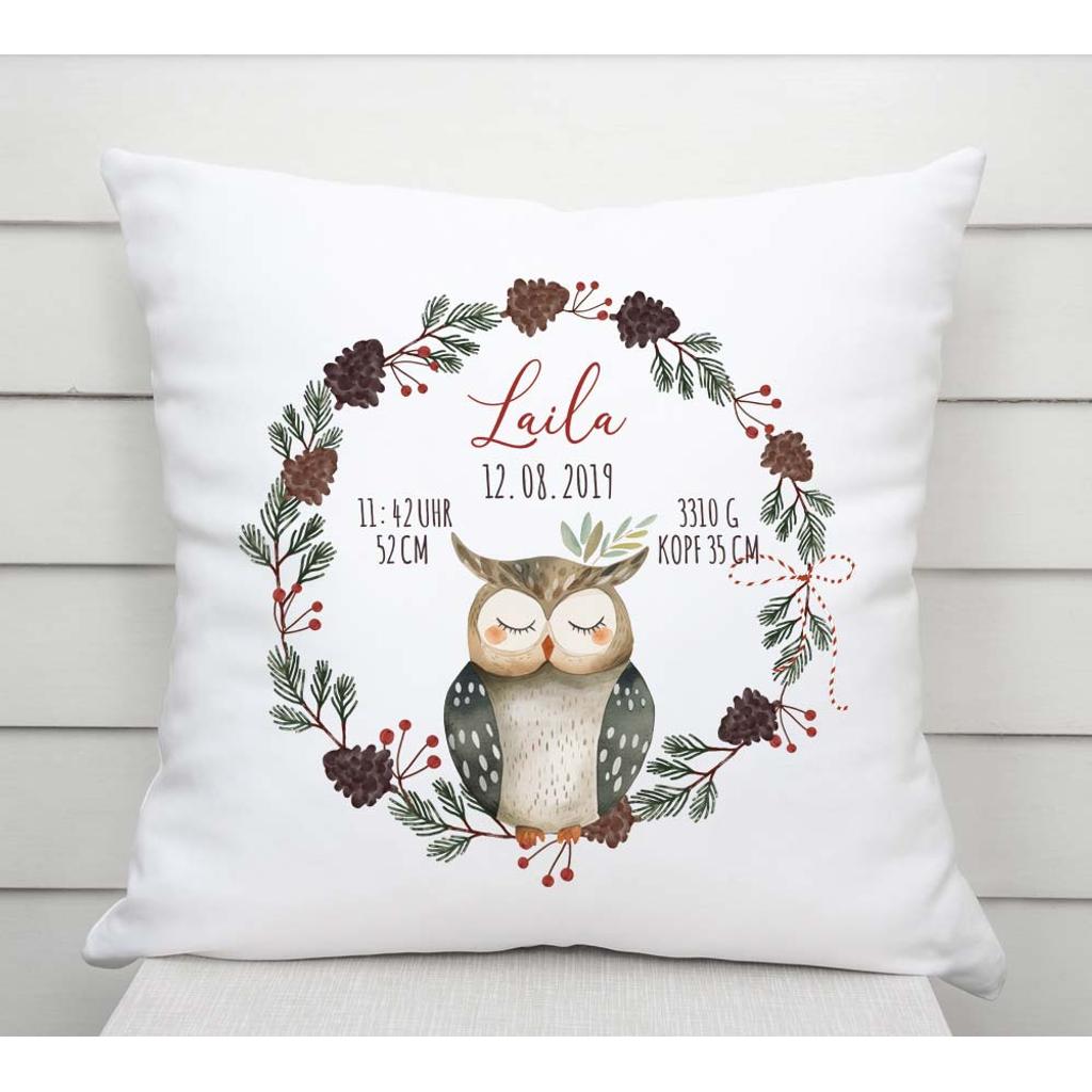 Liebevoll gestaltete Kissen. Personalisiert mit dem Namen und den Geburtsdaten Ihres Kindes.