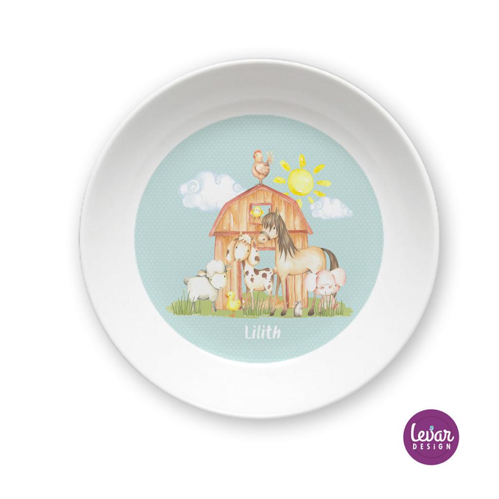 Melaminteller tief/Schale Bauernhof Pferd